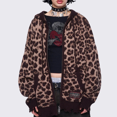 豹纹针织拉链连帽衫