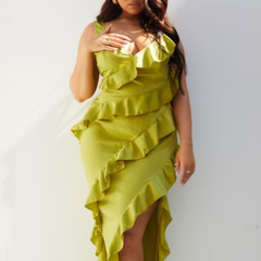 PrettyLittleThing 橄榄绿缎面荷叶边层叠长款连衣裙