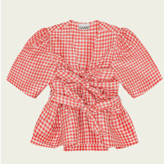 Ganni 泡泡袖 红色格子上衣