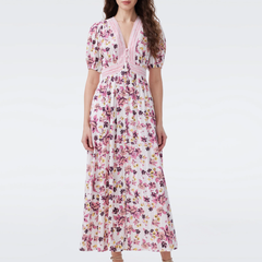 DVF Natasha 柔粉鎏金花圃泡泡袖蕾丝肌理棉连衣裙