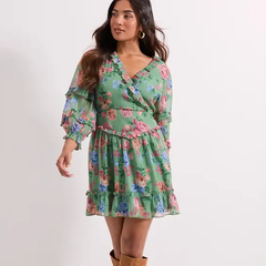 DP 绿色花卉荷叶边裹身印花迷你连衣裙