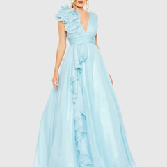 Mac Duggal 浅蓝色荷叶边露肩V领雪纺礼服