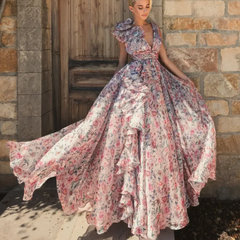 Mac Duggal 粉色无袖V领碎花雪纺荷叶边舞会礼服