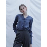 [时尚博主陈苍苍原款]时尚简约V领褶边长袖女士衬衫_藏青色