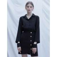 时尚简约翻领切口长袖女士衬衫_黑色