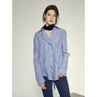 宽松前短后长口袋拼接长袖衬衫_条纹