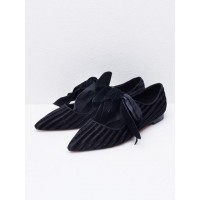 [知名博主雅鲁藏布江女人 *]尖头浅口丝绒蝴蝶结条纹女士低跟单鞋_黑色
