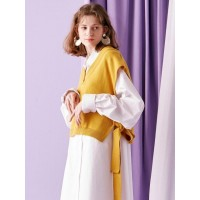 时尚侧领带装饰大V领女士短款针织背心_黄色