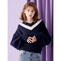 宽松落肩拼色V领女士针织套头衫_藏青色