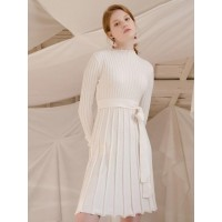 优雅条纹腰带装饰女士针织连衣裙_象牙白