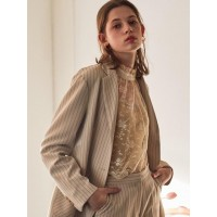 [时尚博主O96D原款]宽松条纹翻领单粒扣口袋拼接女士休闲西装_米色