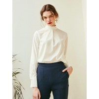 优雅褶裥后丝带装饰半高领雪纺衬衫_象牙白