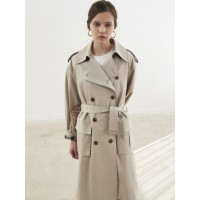 经典款宽松翻领双排扣翻盖口袋腰带搭配女士长款战壕风衣_米色