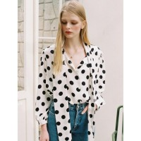 [时尚博主MISSANTI原款]优雅大圆点颈带装饰背部褶皱雪纺衬衫_白色