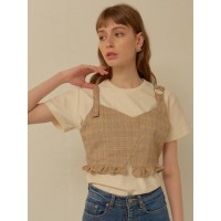 可爱不对称格纹褶边装饰女士短板吊带衫_格纹
