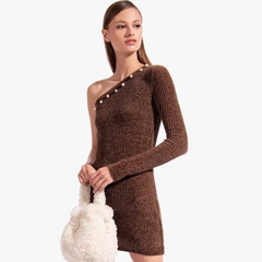 新品!Staud lindsey 露肩不对称螺纹针织连衣裙 摩卡色