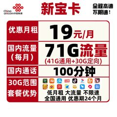 China unicom 中国联通 新宝卡 19元月租(100分通话、41GB通用+30G定向流量)